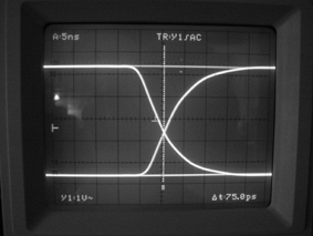 The scope is operated in analog mode, what you see is a superimposition of multiple transitions. This looks quite unsharp because the transitions jitter. The time between the two vertical lines is displayed in the bottom right edge of the screen: the jitter amplitude seems to be about 3 nanoseconds. But how looks a signal with less jitter? The next scopeshot shows the same signal after having been reconditioned with an Altmann Ultra-Precicion-Clock Injector (UPCI):